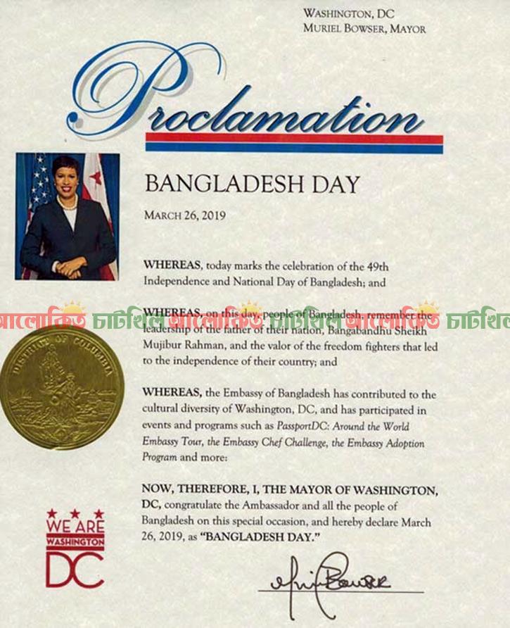 মার্কিন যুক্তরাষ্ট্রের রাজধানী ওয়াশিংটন ডিসির মেয়র ২৬ মার্চকে বাংলাদেশ দিবস হিসেবে ঘোষণা দিয়েছেন। ডিসির মেয়র মিউর্যাল বাউজার এক সংবাদ বিজ্ঞপ্তিতে এ বছরের বাংলাদেশের স্বাধীনতা দিবসের এই দিনটিকে বাংলাদেশ দিবস আখ্যা দিয়েছেন।বিবৃতিতে বঙ্গবন্ধু শেখ মুজিবুর রহমান এবং মহান মুক্তিযুদ্ধে শহীদদের স্মরণ করে তাদের প্রতি শ্রদ্ধা নিবেদনের কথা জানান মেয়র।গত বছরও একইভাবে এই দিনটিকে বাংলাদেশ দিবস আখ্যা দেন ওয়াশিংটন ডিসির মেয়র মিউর্যাল বাউজার।